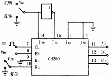 J3r、J3L两端子是三相双三拍的控制端,J6r、J6L是三相六拍的控制端,三相双三拍工作时,若J3r=“1”,而J3L=“0”,则电机正转;若J3r=“0”,J3L=“1”,则电机反转;三相六拍供电时,若J6r=“1”,J6L=“0”,则电机正转;若J6r=“0”,J6L=“1”,电机反转。R2是双三拍的复位端,R1是六拍的复位端,使用时,首先将其对应复位端接入高电平,使其进入工作状态,然后换接到工作位置。CL端是时钟脉冲输入端,EN是时钟脉冲允许端,用以控制时钟脉冲的允许与否。当脉冲CP由CL端输入,只有EN端为高电平时,时钟脉冲的上升沿才起作用。CH250也允许以EN端作脉冲CP的输入端,此时,只有CL为低电平时,时钟脉冲的下降沿才起作用。A0、B0、C0为环形分配器的三个输出端,经过脉冲放大器(功率放大器)后分别接到步进电动机的三相线上。